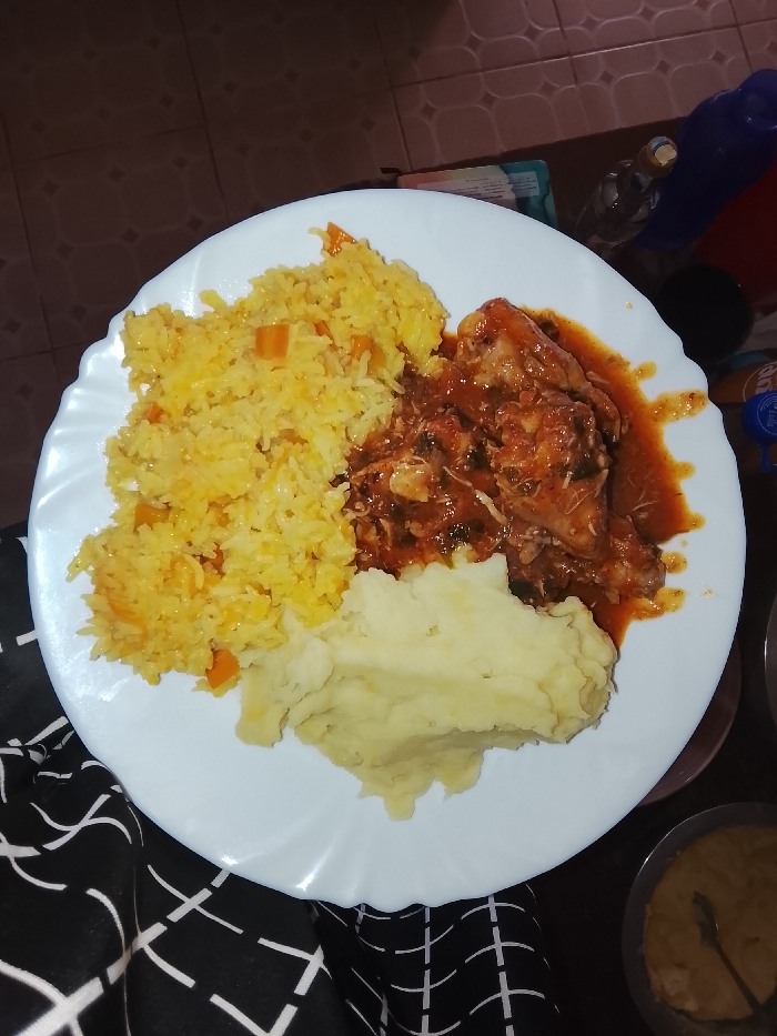 The image displays a close-up, overhead view of a meal served on a white, fluted-edge plate, placed in an indoor setting within the specified location of Kiambu Township ward, Kenya. The plate contains three distinct food components: a portion of yellow rice mixed with diced orange vegetables (likely carrots) on the left, a section of meat (identifiable as chicken pieces) stewed in a rich, reddish-brown sauce with visible green herbs in the upper-right, and a mound of light yellow/cream mashed potatoes or ugali positioned below the chicken and adjacent to the rice. The plate is partially obscured by a leg covered in black fabric with a white geometric grid pattern, indicating the presence of an individual or the meal resting on a lap or a surface close to a person. In the background, dark brown floor tiles with a faint patterned design are visible. To the upper right of the plate, several objects are partially discernible: a blue plastic bottle, a clear glass bottle, and a red object. A small, dark bowl or container, possibly holding additional mashed potatoes/ugali and a spoon, is visible in the lower right corner of the frame. The scene is illuminated by artificial indoor lighting.