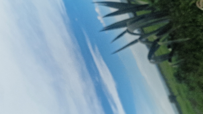 The image depicts an outdoor rural landscape in Ain Chkef, Morocco. The upper approximately two-thirds of the frame consists of a bright blue sky with elongated, wispy white clouds. The lower third of the image features a horizontal expanse of green, out-of-focus vegetation, consistent with fields or natural terrain. Prominently positioned in the immediate right foreground is a large, dark green succulent plant with pointed, upward-curving leaves, visually identifiable as an agave or similar species, also out of focus. The distant horizon shows ambiguous, blurred topographical features or structures. No individuals are present, nor are any specific actions or interactions discernible. The overall image exhibits a soft focus, with a shallow depth of field resulting in significant blur across foreground and background elements.