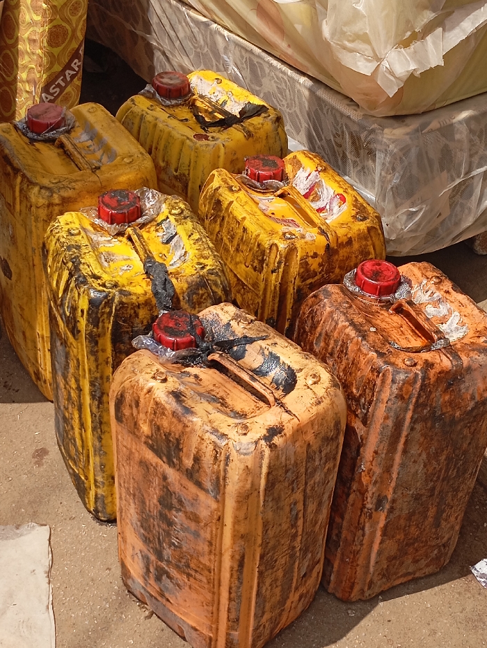 In Bukuru, Nigeria, seven plastic jerrycans are arranged on a light-colored ground surface. Five jerrycans are predominantly yellow, and two are an orange-brown hue. All exhibit significant soiling, with dark, viscous residue streaks and dirt adhering to their exterior surfaces; some also show white paint marks. Each jerrycan is sealed with a red screw cap, with some caps showing additional wrapping of clear plastic or tape. In the upper left background, a portion of a yellowish fabric bag, partially obscured, displays the text "ASTAR". In the upper right background, multiple items, possibly mattresses or furniture, are stacked and encased in clear plastic sheeting. No individuals are present. The scene is illuminated by natural light, casting subtle shadows.
