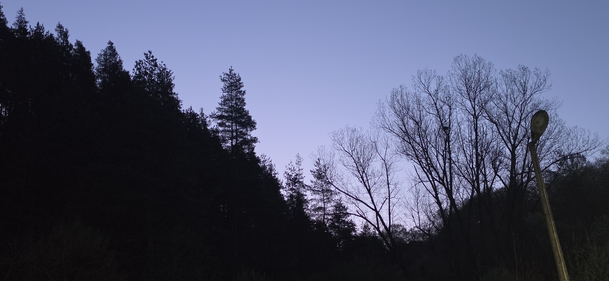 The image depicts a twilight scene, likely in the city of Smolyan, Bulgaria, given the region's topography and vegetation. The left side of the frame is dominated by a dark, silhouetted slope covered in coniferous trees. A few deciduous trees with bare branches are scattered throughout the scene. An old-fashioned street lamp is positioned on the right, its details obscured by the dim light. The sky above transitions from a darker shade near the horizon to a lighter blue-purple hue towards the top of the frame. No people or animals are visible in the scene. The setting appears to be a forested area with limited artificial light sources.