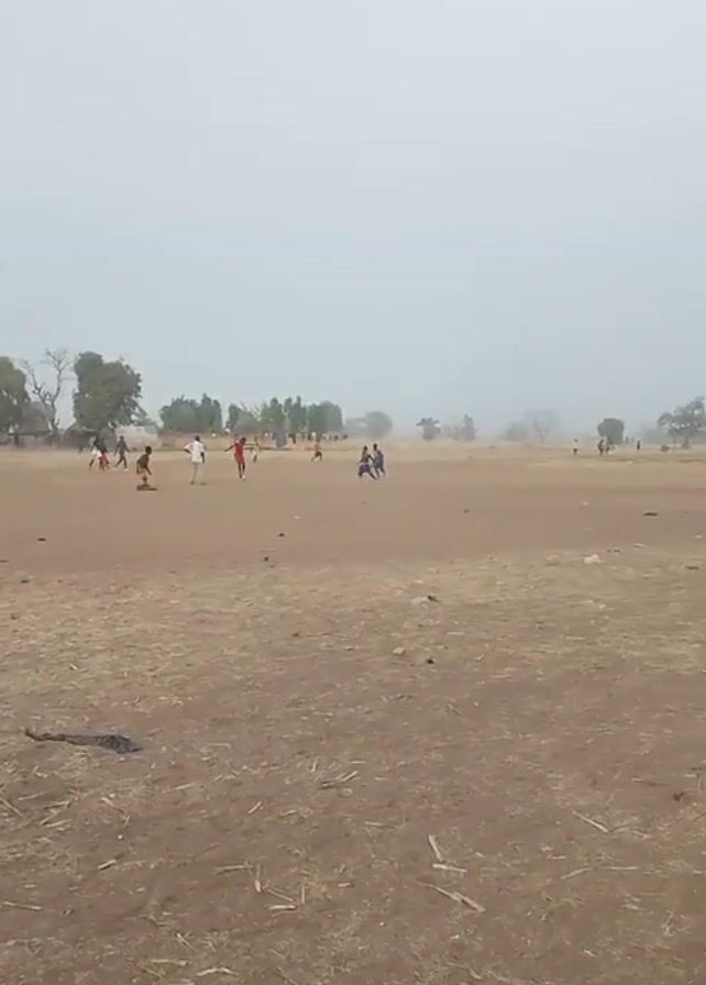 A wide, low-angle shot shows a soccer game taking place on a dusty, brown field. Several figures, seemingly children or young adults, are scattered across the field, dressed in varied, casual clothing, including some wearing red. They are actively running and engaging in the soccer game, with a small cloud of dust kicked up behind one player. The horizon line features sparse trees and what appears to be a small building. The sky is overcast and gray, providing a muted, even light across the scene. The foreground of the field shows debris, including a discarded plastic bag.