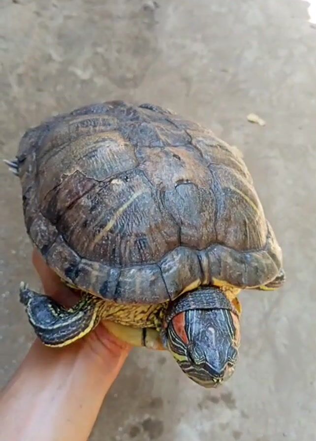 A hand holds a red-eared slider turtle against a plain grey concrete background. The turtle's shell is grey and brown with faint yellow stripes. The turtle has a red stripe behind its eye. The turtle moves its head and feet.