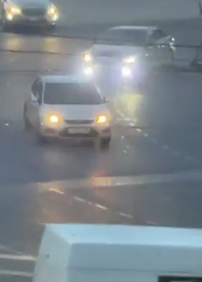 silver Ford Focus making a left turn at an intersection. Other cars are visible at the intersection, including a white SUV with a roof rack, a dark sedan, and a black car. A white van is in the foreground of the shot. There is a patch of grass and trees along the side of the road. The road appears wet. The video is shot from a high angle.