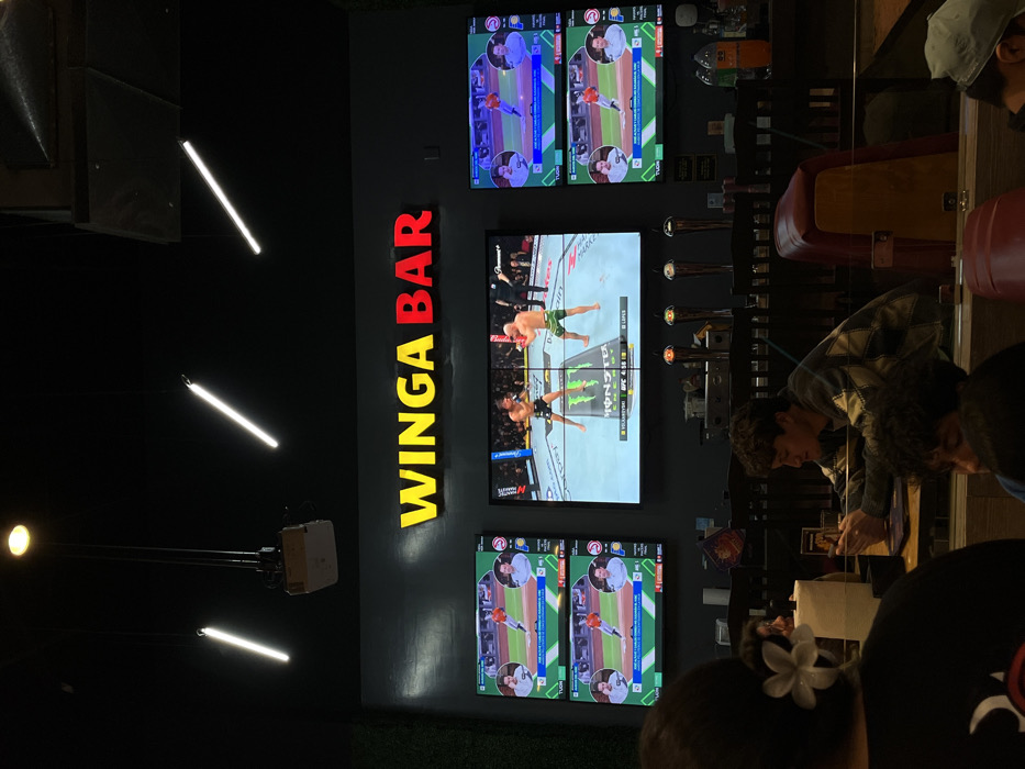 A bar interior with the name "WINGA BAR" in yellow and red lettering on a dark gray wall, adorned with multiple televisions. The top and bottom screens show a baseball game, while the central screen displays a mixed martial arts fight. Patrons are seated at the bar, watching the games, with some appearing to be eating. Long, thin light fixtures hang from the ceiling.