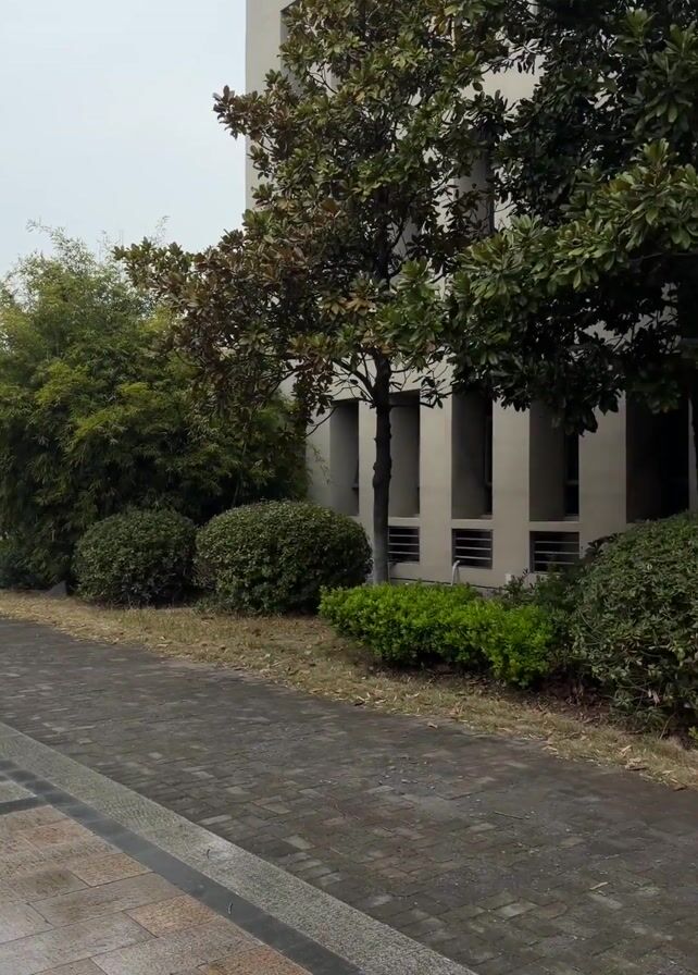 n outdoor scene on a wet day. The ground is paved with light gray rectangular tiles, which are slick with moisture. To the right, a raised strip of brick pavement is separated from the walkway by a dark gray border. Green bushes and a small clump of bamboo are growing alongside the building on the right. A person wearing a tan jacket and dark pants walks away from the camera on the wet walkway. In the distance, several cars are parked near some trees on a street. A tall building can be seen further away. Two red and white traffic cones stand on the walkway between the camera and the person. The sky is overcast.