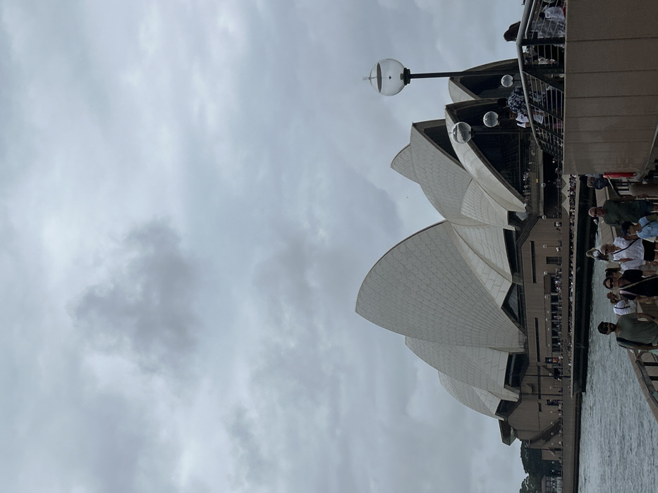 The Sydney Opera House, with its iconic white sails, sits against a cloudy sky