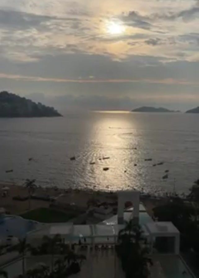 coastal landscape under a cloudy sky with the sun shining through, casting a bright reflection on the water. Several boats are scattered across the water. A beach with people is visible in the foreground. A modern building with a swimming pool and palm trees is situated near the beach. A hilly landscape is visible in the distance.