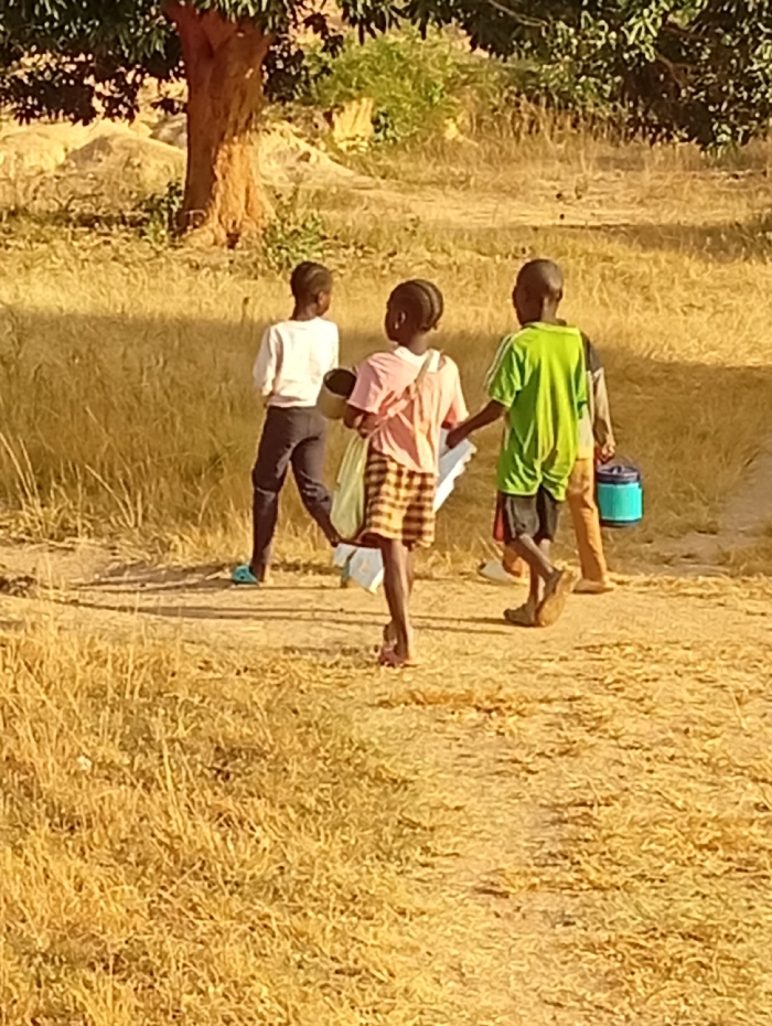 Three children walk along a path through dry, grassy terrain toward a tree. One child wears a white top and black pants; another, a pink shirt and checkered shorts. The third child sports a green shirt and dark shorts. A fourth individual trails behind, carrying a blue container. The landscape suggests a warm, arid climate.