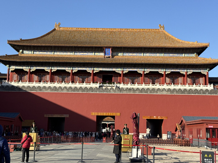 A vibrant red gate with a yellow-tiled roof dominates the scene. Several people are waiting behind rope barriers, with guards standing attentively. The gate's architectural style is traditional Chinese, featuring red columns and intricately patterned windows. Sunlight illuminates the scene, casting shadows across the lower portion of the gate and the plaza below.