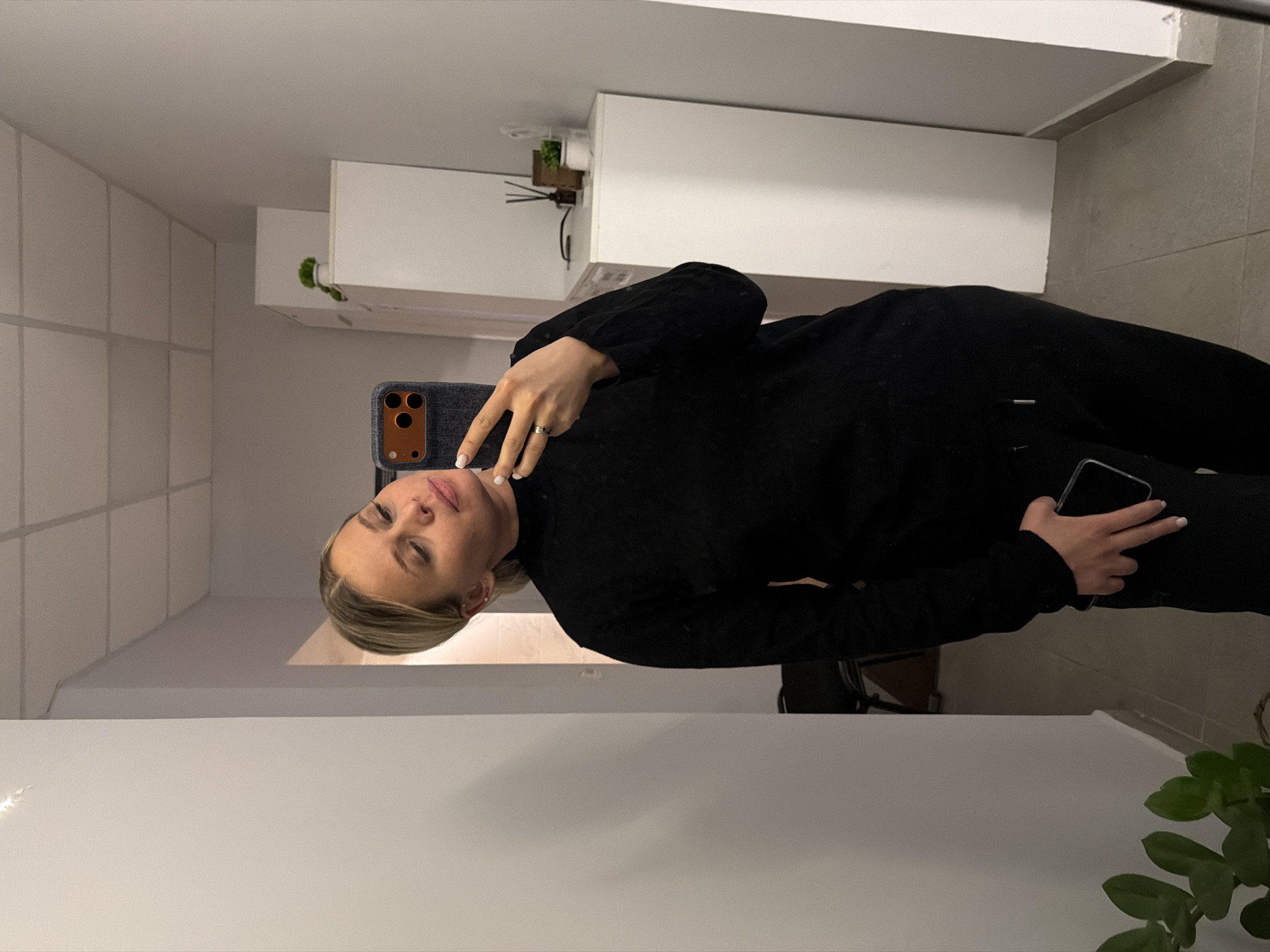 A woman with fair skin and blonde hair is taking a selfie in what appears to be an indoor setting. She is wearing a black sweater and pants. She holds a mobile phone in her left hand to take the selfie, while holding another phone in her right hand. The background consists of a white tiled wall and various interior elements such as cabinets and a potted plant. The exact location within Sarapul, Russia, cannot be determined from the image.