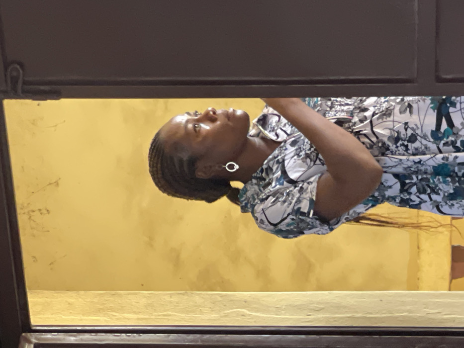 The scene, captured in Okigwe, Nigeria, features an adult female standing within a dark brown door or window frame