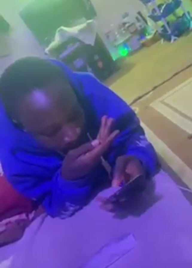 young man lying on his stomach on a light-colored surface (possibly a bed), wearing a blue hooded sweatshirt. He is holding a smartphone in his hands and appears to be looking at it, with one hand partially covering his mouth. There is a white rectangular object on the surface near him, and a charging cable connected to the phone. The room is dimly lit, with a greenish light source visible in the background. Other objects in the background include a television, a small table with various items, and a shelf with what appears to be shoes. The floor is covered with a light-colored rug. The camera angle is slightly above the subject.