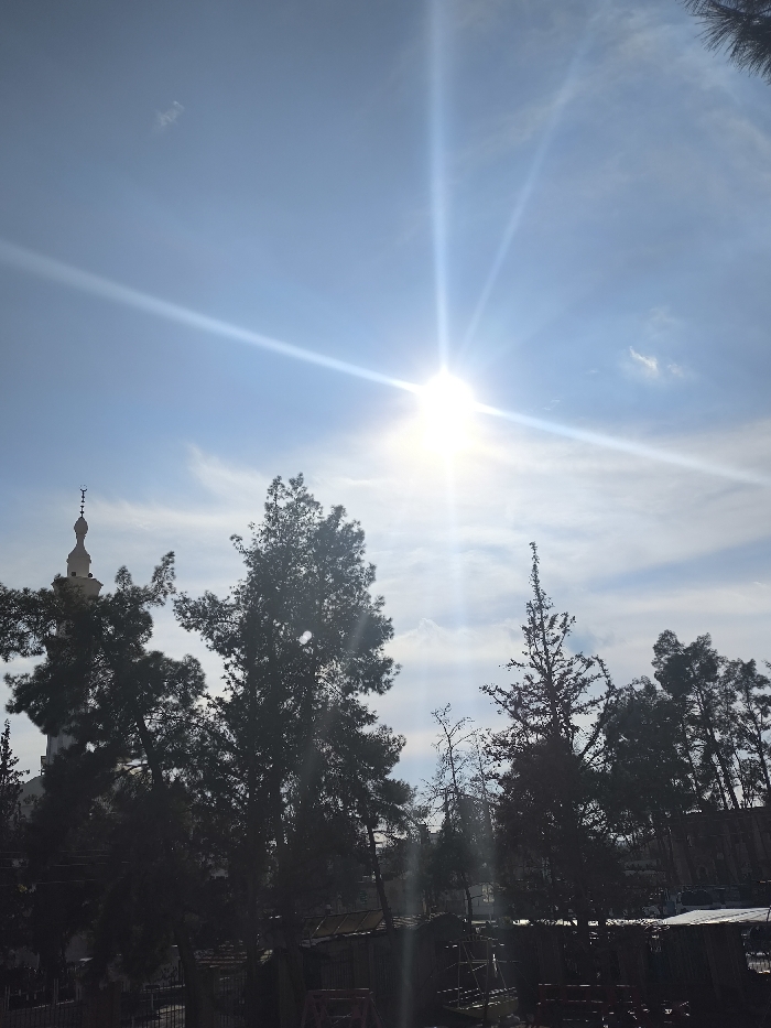 The image depicts an outdoor scene in Jirud, Syria, under a clear, bright sky. The sun, a brilliant white point, is positioned in the upper right quadrant, emitting prominent lens flares that radiate across the sky. The sky is predominantly light blue with scattered thin, white clouds. In the mid-ground, a tall, slender mosque minaret, light in color and topped with a pointed dome and a crescent finial, is visible on the left, partially obscured by dense tree foliage. Numerous dark green coniferous trees, silhouetted against the bright sky, dominate the lower half of the image, extending from left to right. Below the trees, in the foreground, dark, indistinct structures resembling fences, scaffolding, or cluttered ground material are visible in deep shadow. No individuals or specific actions are discernible.