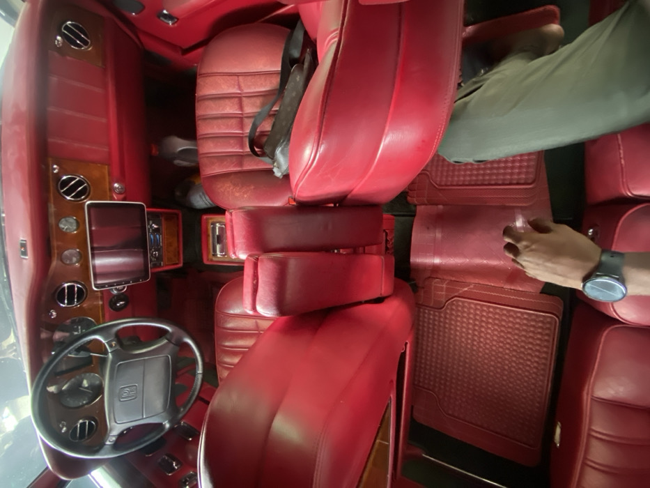 The image depicts the interior of a red luxury vehicle, identified as a Rolls-Royce, located in Igboefon, Nigeria