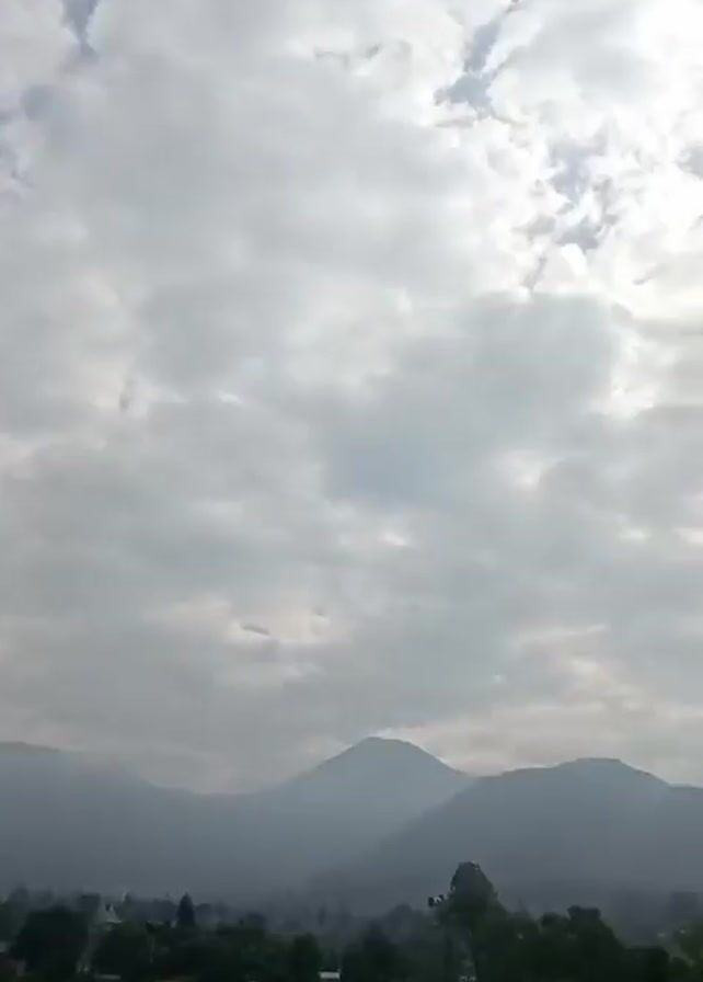 landscape with mountains and a cloudy sky. The mountains are covered in vegetation. There are trees in the foreground and buildings visible among the trees. The sky is mostly covered with clouds, with some patches of blue sky and sunlight breaking through. The camera pans slightly upwards.