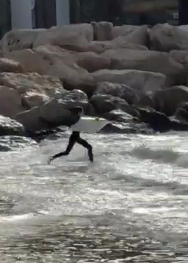 surfer running through the water toward the ocean, past large rocks and a building in the background. The surfer is wearing a dark wetsuit and carrying a light-colored surfboard. He runs into the water and falls, then emerges with the board. The waves crash around him as he wades further into the water.