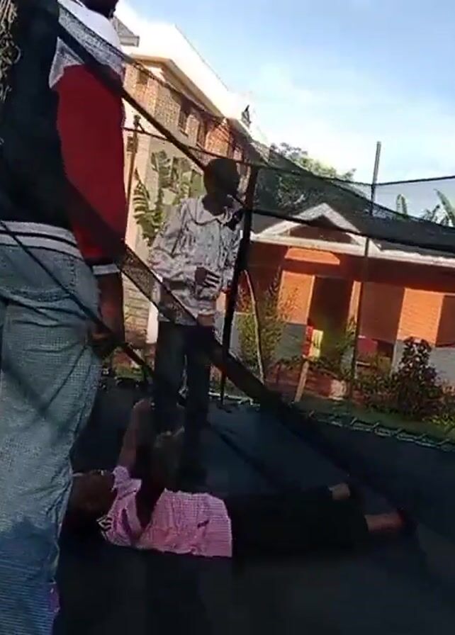 three individuals on a trampoline. One person, wearing a pink patterned shirt and black bottoms, is lying flat on their back in the center of the trampoline. Another person, wearing a patterned hoodie, jeans, and sunglasses, is standing and jumping near the perimeter. A third person, wearing a jacket with red sleeves and patterned pants, is standing near the trampoline's edge. The trampoline is surrounded by a safety net. In the background is a residential building with an orange exterior and a black roof. The sky is visible overhead.