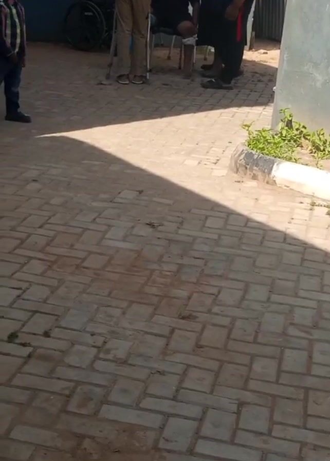 The scene shows an outdoor space paved with brick. In the upper part of the frame, there are several people gathered in a semi-circle around someone seated in a chair. The person sitting down appears to have their leg bandaged. To the left of the group, a wheelchair is visible. The group appears to be talking, and the person in the chair is smiling. There is a shadow cast across the brick pavement in the lower portion of the frame. To the right, there is a small patch of green plants growing along the edge of a building.