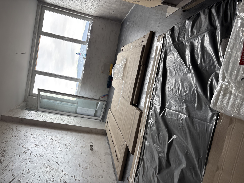 The image displays an unfurnished room in Sofia, Bulgaria, exhibiting features consistent with a renovation or pre-furnishing stage. The room's walls are finished with a light grey, textured plaster, while the floor is covered in large, dark grey tiles. A large, multi-pane window unit occupies one wall, providing a panoramic view of the city, distant mountains, and the distinctive spired top of the Monument to the Soviet Army under a cloudy sky. Adjacent to the windows, a white-framed door, likely leading to a balcony, is partially open. In the midground, several large, flat, brown cardboard boxes, presumed to contain unassembled furniture components, are arranged on the tiled floor. A crumpled clear plastic sheet rests on one of these boxes. In the foreground, a large black plastic sheet or drop cloth is spread across the floor. Next to it, a partially visible white plastic bag, likely containing protective packaging material, is present. Near the base of the window unit, a blue plastic item and a yellow item, possibly tools, are on the floor, and a plastic water bottle is positioned on the windowsill. No individuals are present in the scene.