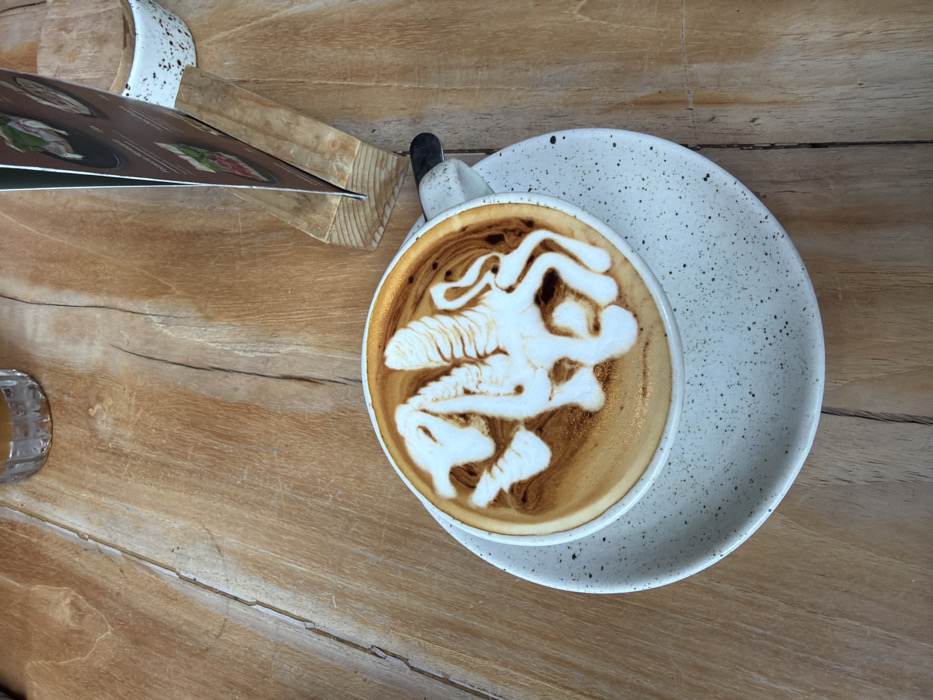 A latte with intricate latte art sits on a speckled ceramic saucer atop a wooden table. The latte art features a stylized design, possibly a creature or abstract form. A menu propped up in a wooden stand is visible near the cup. A small glass vessel is partially visible at the lower left. The table has a rustic, textured appearance.