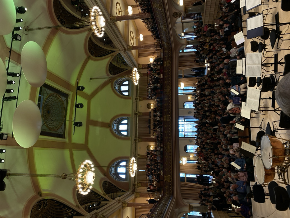 This image depicts the Großer Saal (Great Hall) of the Stadthalle Heidelberg (City Hall) in Heidelberg, Germany, viewed from the approximate location of a stage. The grand hall features a high, vaulted ceiling adorned with intricate gold and cream plasterwork and illuminated by multiple large, ornate chandeliers. Overhead, modern stage lighting, including track-mounted spotlights and several large, oval-shaped white acoustic reflectors or diffusers, is suspended, casting a noticeable greenish ambient light onto sections of the ceiling. The hall is densely populated with an audience of predominantly adults, seated across the main floor and multiple elevated, ornate balconies. The balconies feature gilded railings with intricate scrollwork. All individuals are oriented towards the front performance area, dressed in varied casual to smart-casual attire. Several arched windows along the upper walls allow natural light into the space. In the immediate foreground, on what appears to be the performance stage, two prominent copper timpani drums with mallets are positioned on the left. Numerous black music stands, each holding sheet music, are arranged alongside corresponding black chairs, indicating an orchestral setup. A partial view of an individual's head and shoulders is visible at the very bottom center of the frame. The scene captures the static presence of an audience within a grand performance venue.