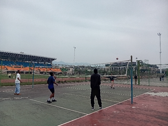 A group of people plays volleyball on a weathered court with a net in the center. Two figures are on one side, one ready to hit the ball and another watching. On the other side, one person is mid-jump to hit the ball, another stands ready, and a third observes. A stadium with orange and blue seating serves as a backdrop, along with distant hills under an overcast sky. A tall lighting structure stands to the right of the stadium.