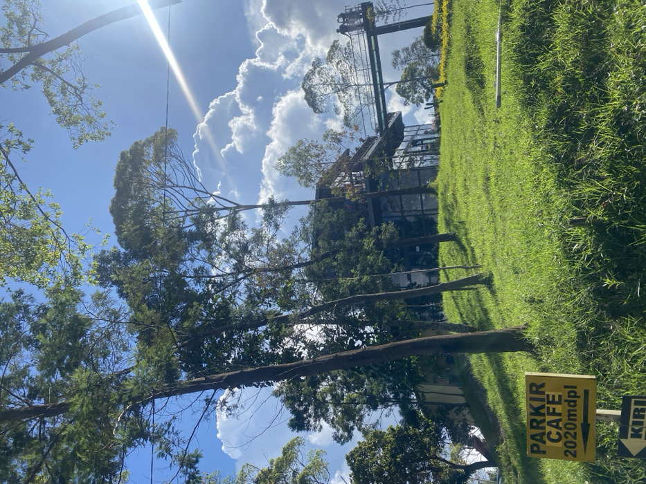 The scene is a forested area in Kecamatan Tawangmangu, Indonesia, with a modern, multi-level cafe built into the hillside, visible through a dense grove of trees. The building features large windows, and a viewing platform is accessed by a metal walkway and steps. It appears the cafe is closed, as no patrons are present. A yellow sign at the bottom of the frame reads "Parkir Cafe 2020mdpl." The ground in front of the cafe is a verdant, grassy slope. The sky is bright blue, with white clouds, and a ray of sunlight shines through. The cafe appears to be situated on the side of a hill, surrounded by dense forest.