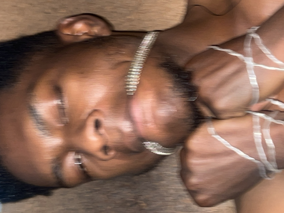 A close-up, blurry image features a dark-skinned man with eyes closed, wearing a diamond-like chain. His hands are positioned near his face, bound with white string or twine. The photograph is taken from a low angle, with the subject lying down. The background appears to be a wooden surface. The overall composition is somewhat distorted due to the motion blur.