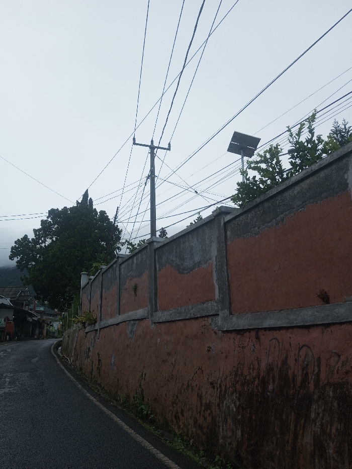 The image portrays a street scene in Babaliya Mal., India, under an overcast sky. A wet, dark asphalt road curves gently to the left, occupying the lower-left portion of the frame. On the right, a long, continuous boundary wall constructed of reddish-brown masonry with grey concrete trim and coping runs parallel to the road; its lower section exhibits dark staining and moss growth. A wooden utility pole, supporting multiple black electrical and communication wires that crisscross the sky, is positioned in the mid-ground. Above the wall on the right, a small, dark rectangular solar panel is mounted on a pole. Dense green foliage, including large trees, is visible behind the wall and to the left of the utility pole. Distant structures, appearing to be residential buildings, are partially visible on the left side of the road further into the background. No individuals are present in the scene.