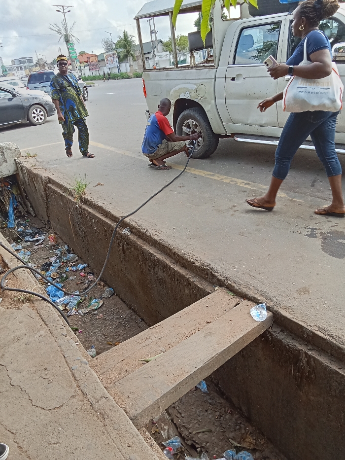 The image depicts a roadside scene in a city, consistent with Owerri, Nigeria. A light-colored pickup truck is parked on the paved road's shoulder, marked by a faded yellow line. A man in a red and blue shirt is crouched, inflating the front passenger-side tire of the truck with a black hose connected to the tire valve. To the right, a woman in a blue t-shirt, blue jeans, and sandals walks from right to left, holding a white smartphone in her right hand and carrying a white tote bag over her left shoulder. To the left of the truck, another man stands, dressed in a patterned blue, green, and yellow traditional attire, wearing sunglasses. In the immediate foreground, an open concrete drainage ditch, heavily accumulated with plastic bottles, bags, and other refuse, runs parallel to the road. Two wooden planks span the ditch, and a black cable/hose from the tire inflator extends across it. Distant buildings, other vehicles, and an overcast sky complete the background.