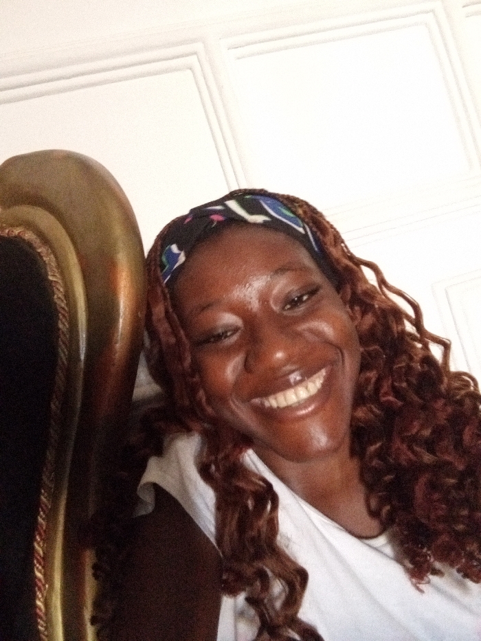 An adult female, characterized by a dark complexion and long, reddish-brown curly hair, is depicted in a close-up, chest-up indoor portrait. She wears a multi-colored patterned headband over her hair and a plain white top. Her head is slightly tilted, and she is smiling broadly, revealing her upper teeth, while looking directly at the camera. To her left, partially visible, is a portion of a golden-bronze piece of furniture, likely a chair or sofa, featuring a dark upholstered section and a braided trim. The background consists of a plain white wall with recessed rectangular paneling, indicating an indoor setting. The specific location in the city of Unknown, Unknown, is undeterminable from the visual information provided.