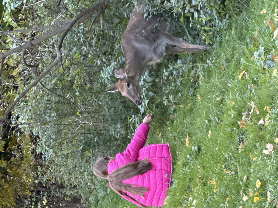 An individual is depicted crouching or kneeling on a grassy incline in a wooded or overgrown area, viewed from behind. The individual wears a bright pink quilted jacket and has long, light brown hair styled in two prominent ponytails or braids. Their right arm is extended forward, offering an unspecified item from their open hand to a deer. The deer, exhibiting mottled brown and white fur with some visible spots, stands on four legs, leaning its head forward with its muzzle approaching the individual's hand. The immediate foreground is covered in green grass interspersed with scattered yellow and brown fallen leaves. The background consists of dense green foliage, including bushes and tree branches. The scene is situated in a natural environment within Novi Petrivtsi, Ukraine.