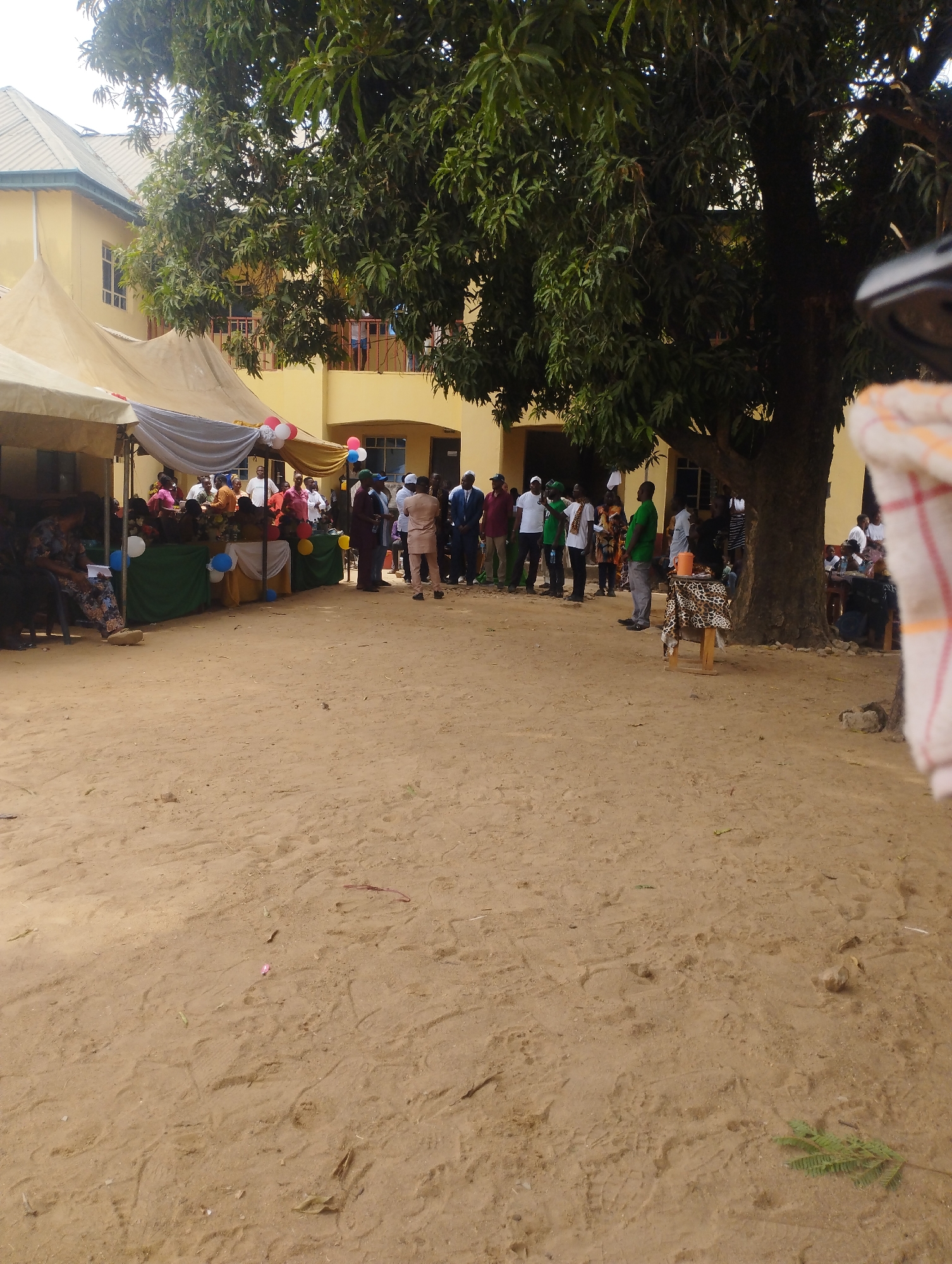 The image depicts an outdoor gathering on an unpaved, sandy ground in Akwanga, Nigeria. A multi-story yellow building with a dark-tiled roof and a reddish-brown balcony railing is visible in the background, partially obscured by a large, leafy tree that dominates the right and upper-central portion of the frame. Two beige event tents are erected on the left, with one tent featuring a grey fabric drape and clusters of red, white, and blue balloons. Beneath the tents, tables are draped with green and yellow fabric, displaying floral arrangements and additional balloons. Approximately 30-50 individuals are present; some are seated under the tents, while others stand in various groups. People are dressed in a mix of traditional patterned clothing and Western attire, including collared shirts, suits, and casual wear. A small wooden stool draped with animal-print fabric holds an orange cup near the base of the large tree on the right side of the foreground. The ground shows footprints and scattered small plant debris.