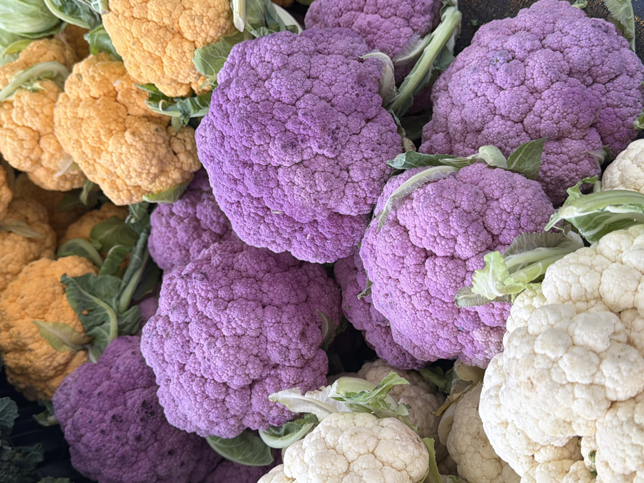 The image displays a tightly packed, static arrangement of numerous cauliflower heads. The cauliflower exhibits three distinct color variations: vibrant purple, bright orange, and traditional white. Each head features a dense, granular floret texture. Green leaves are interspersed among the cauliflower, primarily visible at the base of several stalks. The produce occupies the entire frame in an overlapping configuration. No individuals, explicit actions, or additional environmental details are discernible beyond the vegetable display itself. This scene is consistent with a produce market display located in the city of New York, United States.