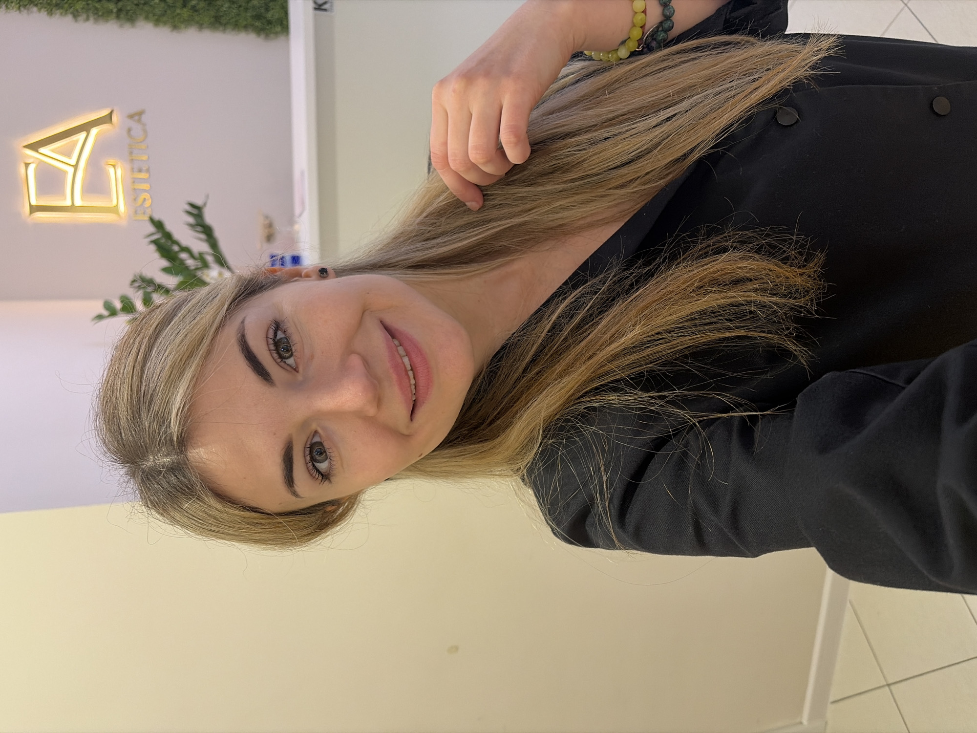 A woman is visible in the foreground of an indoor scene. She is smiling, and her hair is blonde with darker roots. She is wearing a black blazer and a beaded bracelet. Behind her is a wall with a golden sign that reads "AESTETICA" vertically. The sign is illuminated. Above the sign is a strip of green foliage. A white doorway or wall section is visible on the right side of the frame. The lower part of the image is dominated by a plain, light-colored wall. The location is within the city of Budva, Montenegro, as indicated by the name of the business in the image.