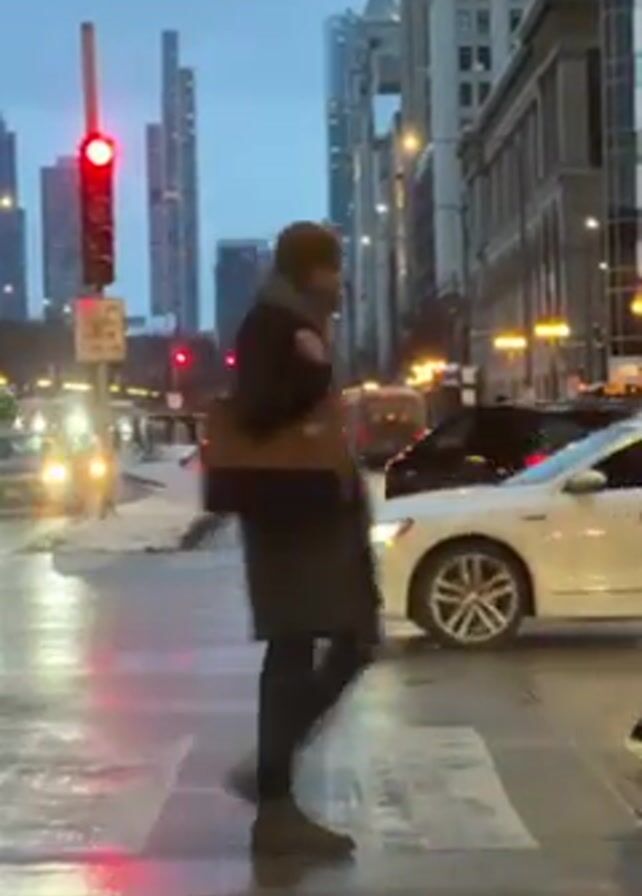 city street on a cold, possibly wet day, with tall buildings lining both sides of the road. Cars and a bus are driving on the street. Two pedestrians are walking across a crosswalk at an intersection where the traffic light is red. The scene gives a sense of urban life in a potentially cold climate.