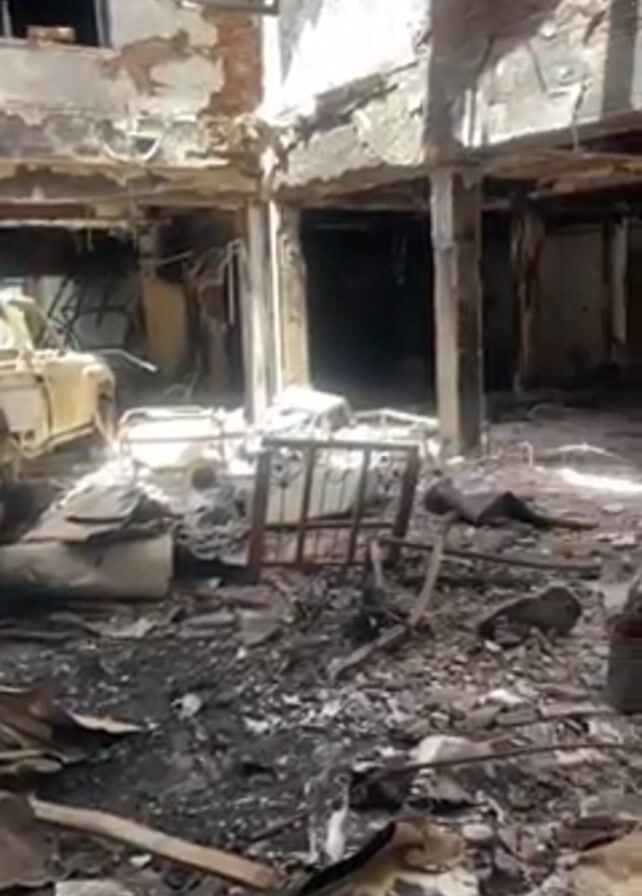 Certainly! Here's a detailed, matter-of-fact description of the video: **Scene:** The video shows the interior of a destroyed building. It appears to have suffered severe fire damage. The floor is covered in charred debris, including metal fragments, pieces of what looks like furniture or appliances, and general rubble. The walls are damaged, with sections of brick exposed and scorched. There are remnants of support pillars, some still standing, others broken or leaning. The roof appears partially collapsed, letting in sunlight. In the middle ground, there's a heavily damaged piece of machinery. Further back, there's a burned-out vehicle. The overall impression is one of devastation and ruin.