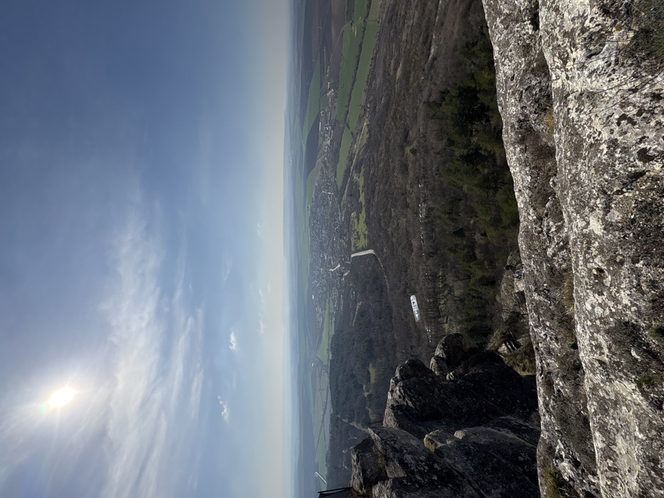 The image depicts a panoramic landscape view captured from a high rocky vantage point in Madara, Bulgaria. In the immediate foreground, weathered, light-colored bedrock and boulders dominate the lower portion of the frame, exhibiting rough textures and patches of lichen. A dark, metallic structure, possibly a railing or a post, is partially visible at the far left edge. The midground features a steep, forested slope descending into a valley. The trees are predominantly bare deciduous, with interspersed evergreen conifers. Two small, indistinct human figures are visible on a rocky outcrop approximately one-third of the way down the slope; one appears seated, the other standing. Further down the slope, a long, white, rectilinear structure, possibly a covered walkway or a building, is situated amidst the trees. A winding asphalt road traverses the wooded area and extends into the valley. The background presents a sprawling settlement, identified as Madara village, characterized by numerous buildings with light-colored roofs. This village is surrounded by agricultural fields, distinguishable by sections of green vegetation and tilled brown earth. A hazy horizon line indicates distant hills or mountains. The sky occupies the upper two-thirds of the image, displaying a bright, clear blue with scattered wispy white clouds. The sun is prominently visible in the upper left quadrant, casting a strong glare. The overall scene is illuminated by bright daylight, suggesting a morning or late afternoon timeframe. No explicit actions or interactions beyond observation of the landscape are discernible.