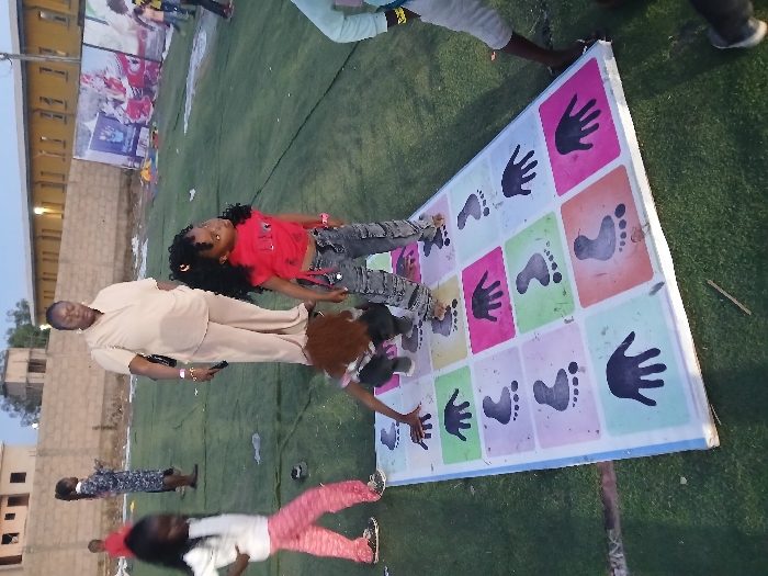 An outdoor scene displays a game mat with hand and footprint symbols. A woman in a beige suit stands alongside a young girl in a red shirt and jeans who is lying on the mat. Another child with brown hair is nearby, while other figures are visible in the background, including children in casual attire. The setting appears to be an artificial turf area, with buildings visible in the distance.