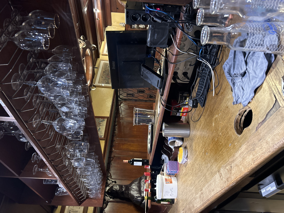 This image depicts the interior of a traditional bar or restaurant counter, typical of establishments found in Strasbourg, France. The environment features dark wooden wall paneling with carved details in the background. Numerous framed pictures are mounted on these walls. Above the counter, a wooden shelf system with metal racks holds a large collection of clear, inverted glassware, primarily wine glasses of varying sizes. The bar counter itself is constructed from aged, light-colored wood. From left to right: * Several bottles, including multiple red wine bottles, are arranged behind a white plastic bucket marked "PM / 10-12". * Adjacent items include a small purple patterned box, a yellow container, a small wooden bottle rack, a ceramic mug with blue designs, and a stainless steel pitcher. * Further along, a large stainless steel ice bucket sits on a metal tray. * Electronic equipment occupies the central-right portion of the counter, including a black Iiyama computer monitor, a black stand for a smartphone or tablet, a black Epson printer, and a black speaker unit. These devices are surrounded by an extensive tangle of black and white electrical wires, cables, and power strips. * A compact black keyboard is placed on the counter in front of the electronics. * A circular, worn hole is present in the wooden counter surface. * A crumpled gray cloth lies near this hole. * On the far right, four empty, clear glass bottles, each featuring a wavy textured pattern and a partially visible blue logo, are lined up. No people are present, and no actions or interactions are depicted within the frame. The scene presents a static view of a functional bar area.