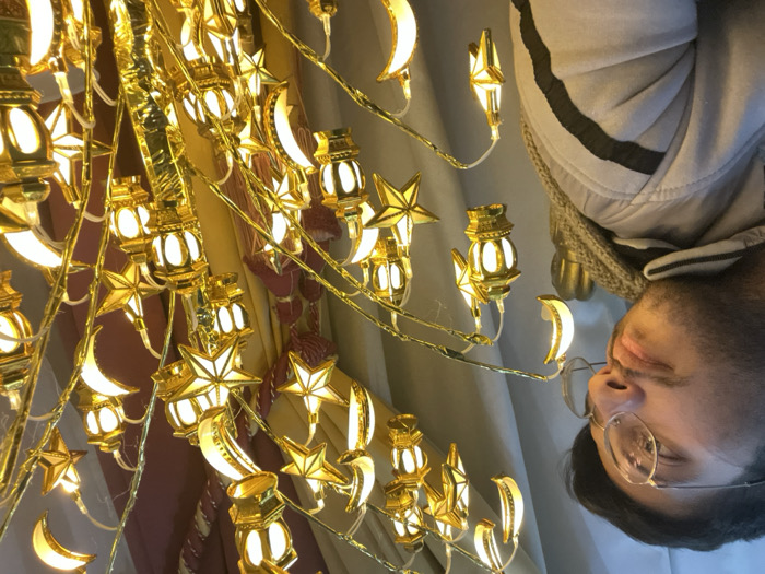 A person wearing glasses, a gray hoodie, and a beige scarf is looking at a decorated arrangement of golden stars, crescent moons, and lanterns. The decorations are illuminated and attached to thin, golden branches. A patterned fabric can be seen behind the decorations. The scene is rotated clockwise.