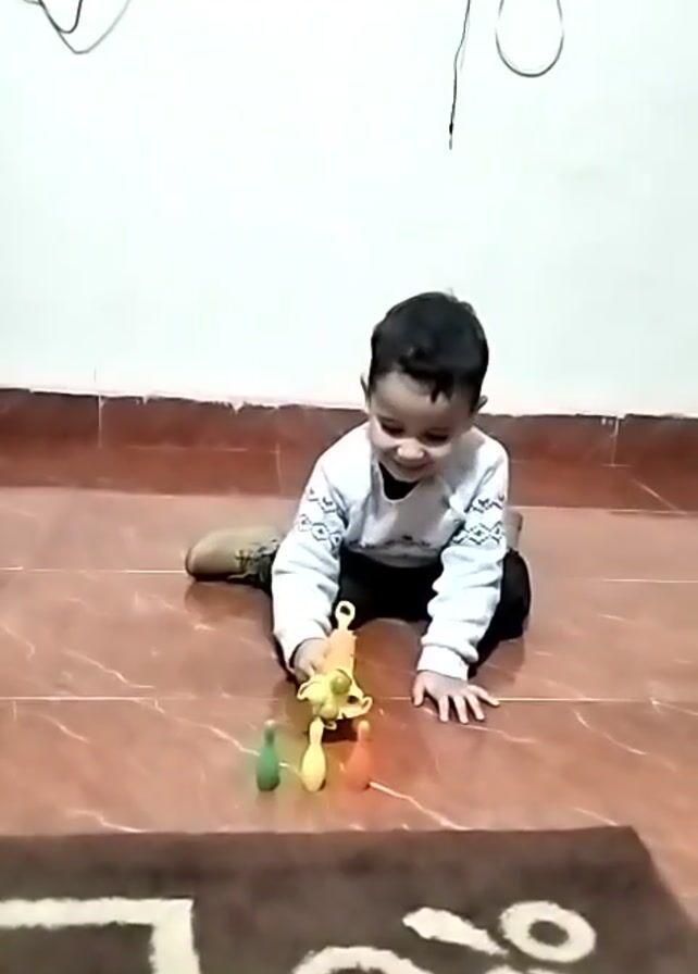 A small child is sitting on a brown tiled floor in a room with white walls. He is wearing a white sweater with a patterned design, dark pants, and brown shoes. He is playing with a yellow toy that shoots small, colorful bowling pins. He knocks down the pins with the toy and smiles brightly. A person wearing jeans and white shoes comes into the frame to assist him with the toy. There is a brown rug with a decorative pattern on the floor in front of the child. Wires are visible on the white wall behind him.