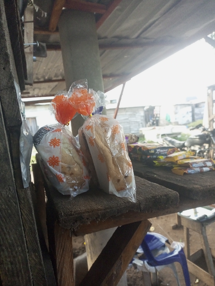 The image depicts a close-up view of a street vendor's stall, presumably in an unknown city. In the foreground, a rough-hewn wooden tabletop extends across the frame. Two loaves of bread, each individually sealed in clear plastic bags with white and orange patterned labels, stand upright on the table. Behind and slightly above the left loaf, two small, transparent plastic bags containing bright orange, irregular-shaped items (possibly candy or fruit-based snacks) are visible, suspended by ties. To the right of the bread, various packaged snack items are arrayed on the wooden surface; some packages are dark with "Xtreme" branding partially visible, while others are yellow and brown rectangular bars. The background reveals an open-air or semi-enclosed structure with a corrugated metal roof supported by a large, light-colored concrete pillar. The roof structure includes visible wooden supports. Beyond the stall, the scene is brightly illuminated, suggesting daytime, with a somewhat overexposed view of indistinct buildings or structures in the distance. Elements consistent with an outdoor market or roadside setting, including what appears to be part of a motorcycle on the far right and a blue plastic chair beneath the table, are discernible. No individuals are visible in the scene.