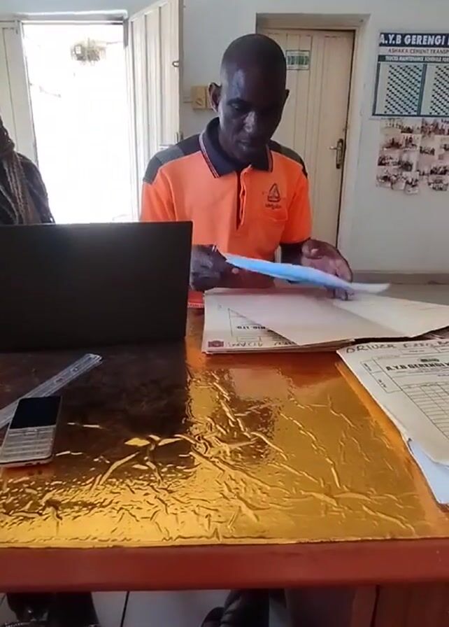 A brightly lit office scene shows two individuals working at a table. On the left, a woman with braids is seated, typing on a black laptop. Next to her is a metal ruler and a silver flip phone. Adjacent to the laptop, there are loose papers. To her right, a man wearing a bright orange polo shirt is reviewing documents, flipping through pages in a binder. The table is covered with gold foil, reflecting the overhead light. The background includes an open doorway and a closed white door. A poster with text "A.Y.B GERENGI TRA" and images is fixed to the wall behind the man.