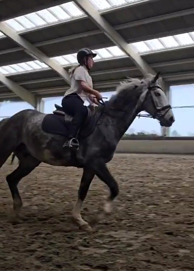 - "A woman wearing a helmet rides a gray horse at a canter inside a large indoor riding arena" by FM-dTRWD3, licensed under CC BY 4.0