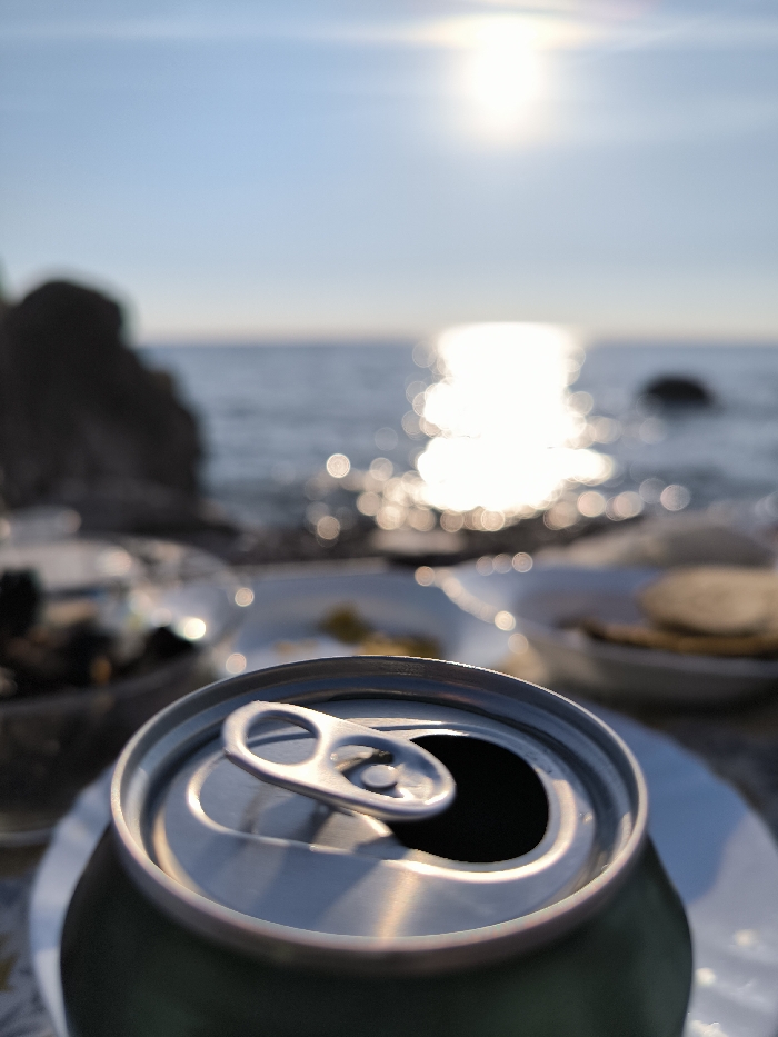 The image depicts a close-up, low-angle view of a partially consumed, open beverage can in the foreground. The can is primarily dark-colored (appearing dark green or grey) with a silver-toned aluminum top, featuring the pull-tab mechanism clearly visible and in an upward, open position. The can rests on a white, circular plate which is situated on a patterned surface, possibly a tablecloth or table. The background, rendered out of focus, reveals a coastal environment in Bar, Montenegro. A large body of water, identified as the sea, stretches to the horizon. A bright, low-lying sun is visible in the upper center of the frame, casting a strong, vertical reflection of shimmering light across the water's surface. This reflection is characterized by distinct bokeh effects. To the left of the frame, a dark, rocky formation rises from or near the water. Another smaller, dark object, likely a rock, is visible in the distant water to the right. Additional blurred white plates and indistinct food items are present on the table surface behind the main can, indicating an outdoor dining setting. The sky above the horizon is a clear, light blue. The scene is illuminated by natural light, consistent with either sunrise or sunset.