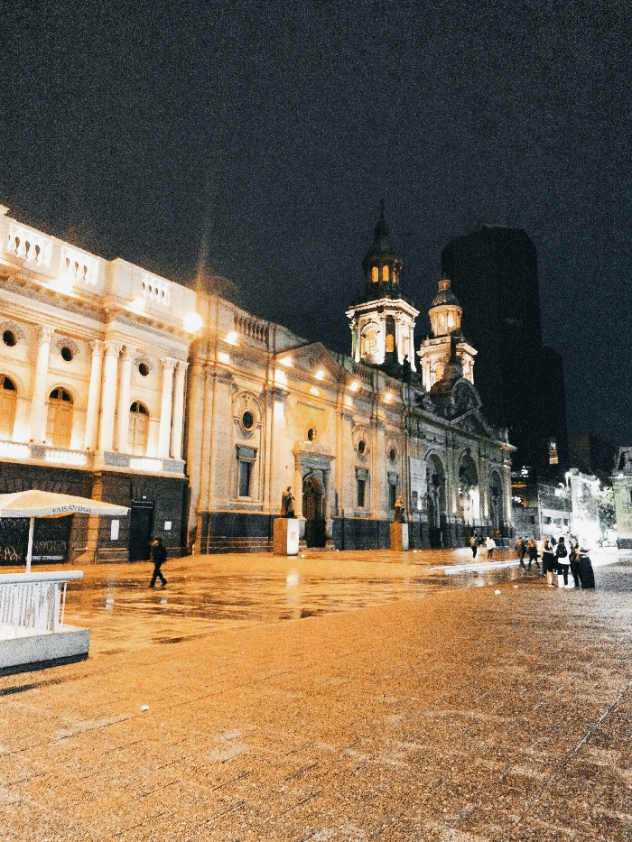 Illuminated buildings at night dominate the view. Ornate architecture with towers and columns line a reflective plaza. People are present, some walking, others gathered in groups. A dark, towering structure rises in the background. A small stand is visible on the left, partially obscured by an umbrella. The ground appears wet, reflecting light from the buildings and streetlights. The scene has a grainy texture.