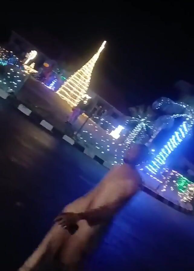 The video depicts a nighttime scene with Christmas decorations. A road runs along the bottom of the frame, with a curb separating it from a grassy area. The decorations include a Christmas tree illuminated with white lights, a palm tree similarly decorated with blue lights, and other decorations with a mix of white, green, and red lights. A person in a light-colored shirt walks across the frame in front of the decorations. The scene is dimly lit by streetlights. The camera angle is skewed, giving a tilted perspective of the scene.