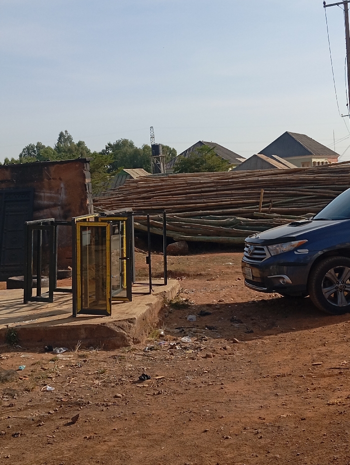 A line of black-framed, glass-doored kiosks stands on a concrete platform beside a dirt road littered with trash. A pile of long, thin logs stretches behind the kiosks, partially obscuring houses with peaked roofs. A dark blue SUV is parked next to the logs. An electrical pole stands tall in the background, amidst a clear, light blue sky. A dilapidated brick structure is visible to the left of the kiosks.