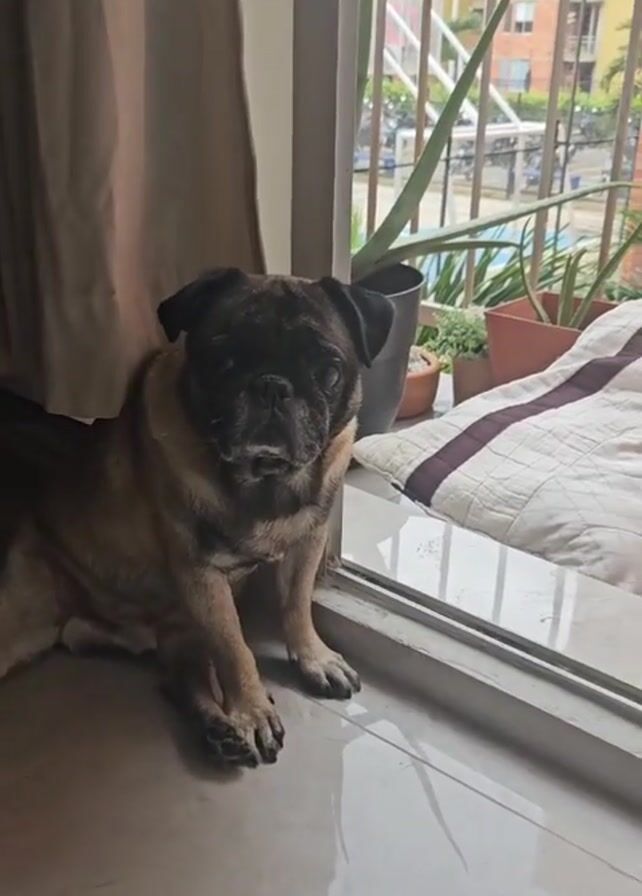 A medium shot shows a tan-colored pug sitting on a shiny floor next to a sliding glass door